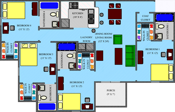 Each unit has 4 bedrooms with shared common areas. Each bedroom includes its own walk-in closet and full bathroom.